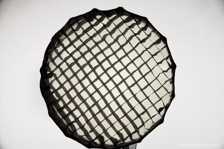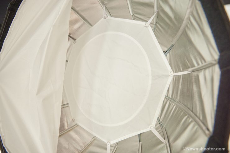 Once built, it is a nice and compact softbox. Included is a removable diffusion. You get only one density and an inner baffle to help reduce a hot spot. This size is great for interviews, tabletop light, and other tighter shots. Since it’s a smaller size, the light will fall off faster.