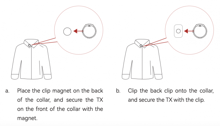 The preferred placement for the TX is at the collar. If speaking with a loud volume, you can choose an upper chest position. You can wear it using either the back clip or clip magnet.