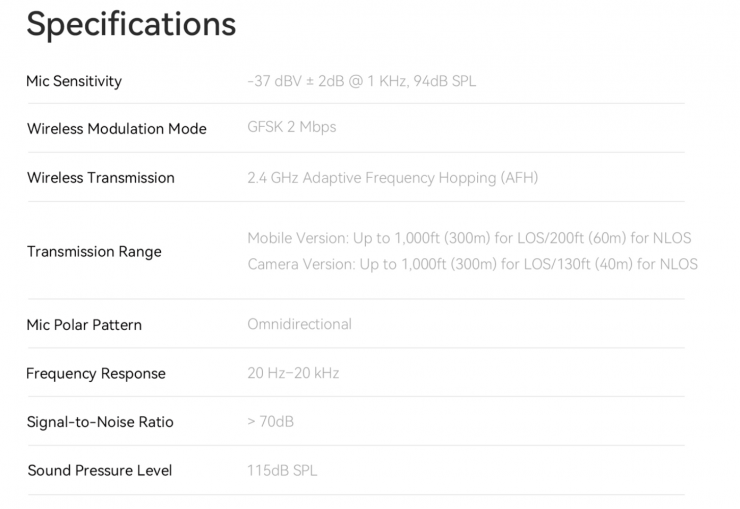 The microphone’s high-gain LDS (Laser Direct Structuring) antenna is claimed to reduce signal blockage caused by the human body, providing stable, uninterrupted audio transmission. Hollyland claims that range of up to 300 meters / 984 feet (line of sight) is possible when using the LARK M2.