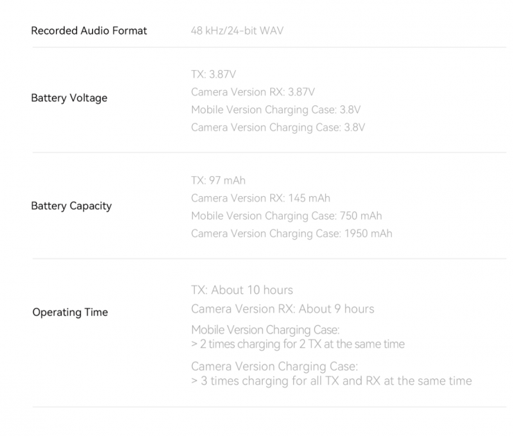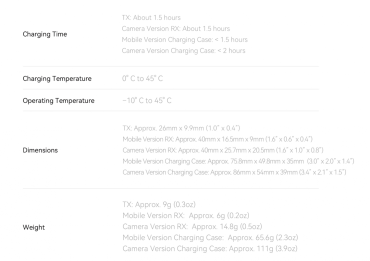 The LARK M2 can operate continuously for up to 10 hours. The system comes in a compact and portable charging case that can charge the entire set twice. It takes less than 1.5 hours to fully charge. The camera version provides an operation time of up to 40 hours, while the mobile version has a battery life of 30 hours with the charging case. The system can be charged while in use.