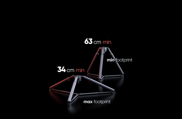 Tripod X can be adjusted from a minimum height of 34cm up to a maximum height of 148cm. The lengths of the connecting rods, which determine the spacing between the legs, can be adjusted while standing up, without the need to crouch down.