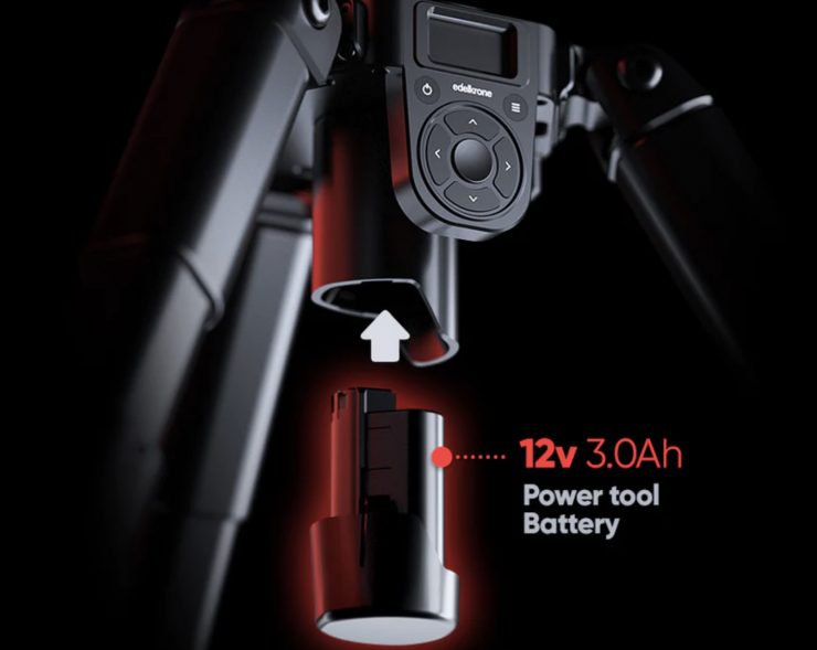 Tripod X is powered by a 12v 3.0Ah power tool battery. According to edelkrone, this battery allows Tripod X to work for weeks on a single charge. The battery is detachable and a charger is included.