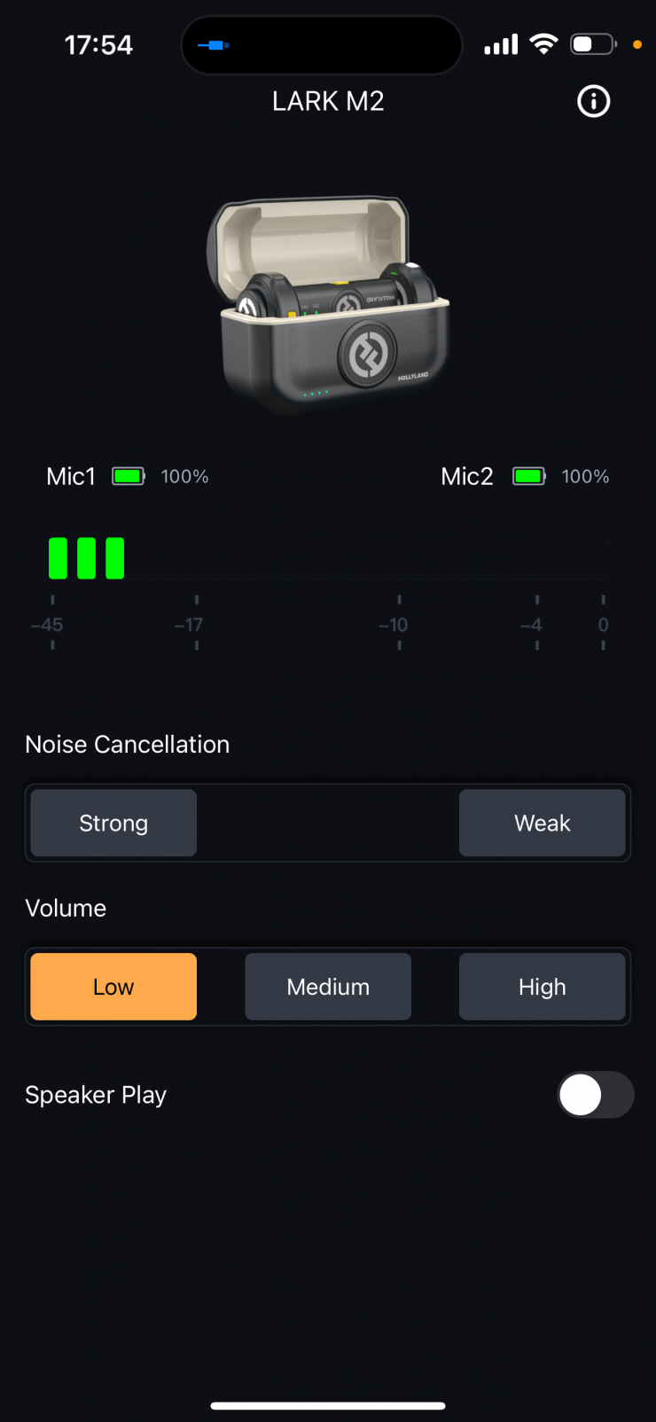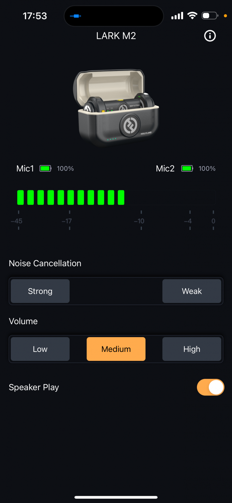 The LARK M2 supports Hollyland’s LarkSound app, which allows for one-tap firmware updates, volume and noise cancellation adjustments, and real-time audio status checking.