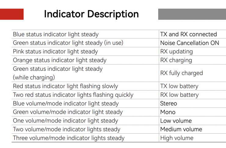 Above you can see what all of the various colored lights mean for the TX units, Camera RX, and Mobile version RX units.
