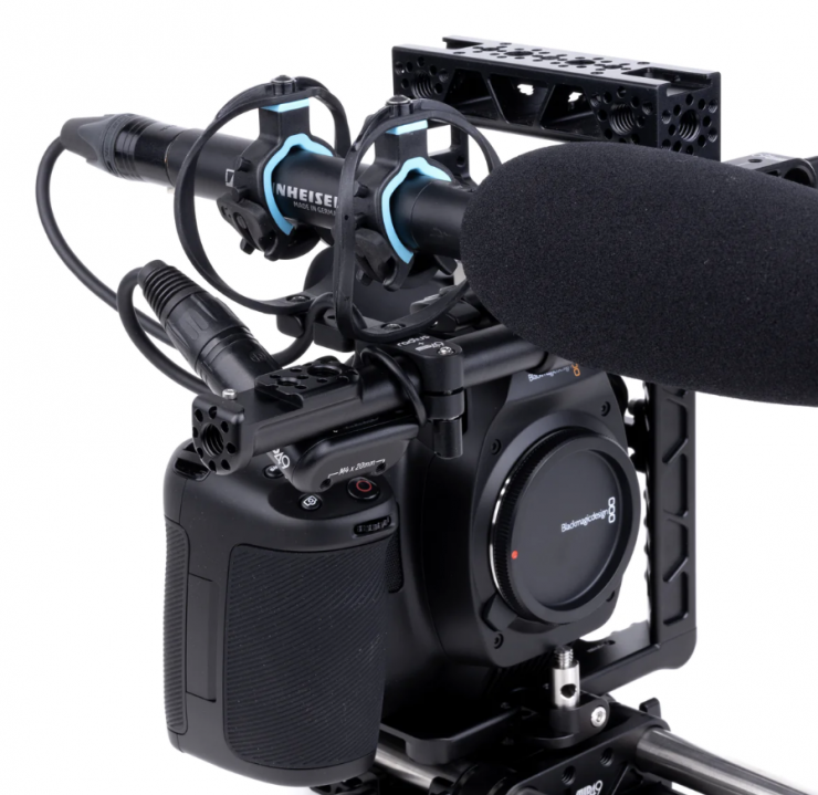 The Microphone Shock Mount was made in collaboration with Radius Windshields, and it mounts to a top 15mm rod like that found on Sony Burano and other similar cameras.
