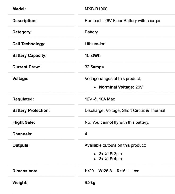 Giant Battery Capacity: With a massive 1050Wh of energy, the Rampart MXB-R1000 is designed to keep your equipment running longer, ensuring uninterrupted operation on set or in the field.