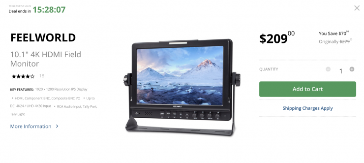 The FeelWorld 10.1″ 4K HDMI Field Monitor is on sale for $209 USD, which is. saving of $70 USD.