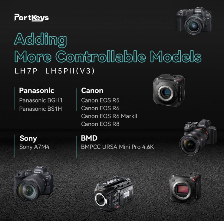 - The PORTKEYS LH5P II (v3) adds WiFi and Bluetooth control for the Panasonic BGH1/BS1H, the Canon EOS R5/R6/R6 Mark II/R8, the Sony A7M IV, and the Blackmagic Design URSA Mini Pro 4.6K. The LH5P II (v3) can also control many different Sony, Canon, Panasonic, BMD, and ZCAM E2 cameras via an optional LANC, USB-C, or Mini/Micro USB cable.