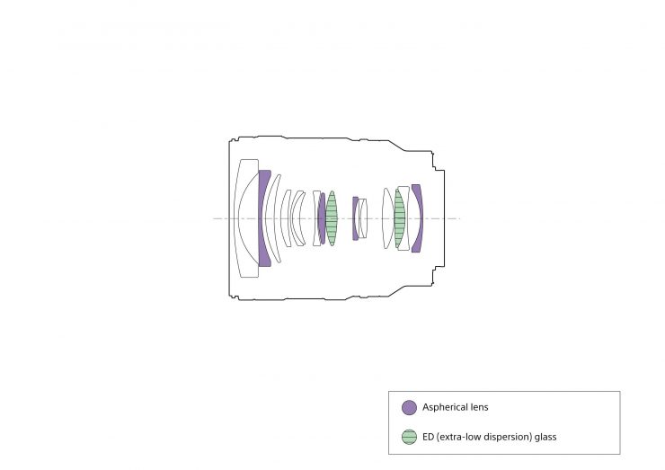 The FE 24-50mm F2.8 G’s design is compact with a filter diameter of φ67 mm, maximum diameter of 74.8 mm (about 2.94 in), length of 92.3 mm (about 3.63 in), and weight of approximately 440 g (about 15.52 oz). Despite its compact size, the lens maintains exceptional image quality throughout all focal lengths. This is made possible by the incorporation of four aspherical lenses and two elements of Extra Low Dispersion (ED) glass. These advanced elements effectively minimize chromatic aberrations, resulting in high-resolution performance that remains consistent from the center to the corners of the frame.