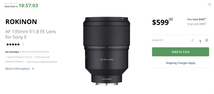 The Rokinon AF 135mm f/1.8 FE Lens for Sony E is on sale for $599 USD, which is a saving of $400 USD.