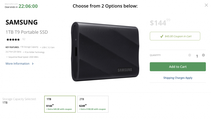 The Samsung 1TB & 2TB T9 Portable SSDs are on sale for $144.99 USD and $249.99 USD respectively.