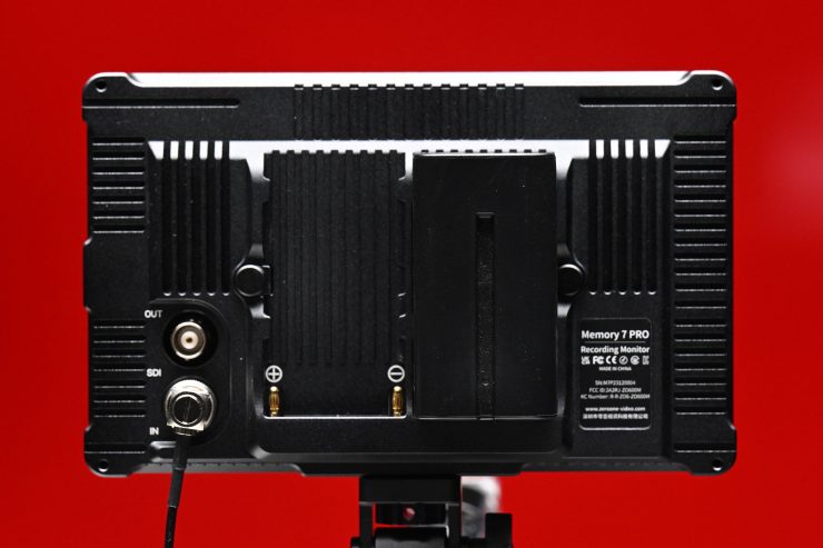 On the back of the Memory 7 Pro you will find the SDI In and Out ports (which are recessed), and the built-in dual Sony NP battery plates.