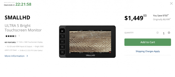 The SmallHD ULTRA 5 Bright Touchscreen Monitor is on sale for $1,449 USD which is a substantial saving of $750 USD.