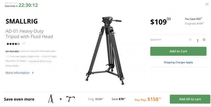 The SmallRig AD-01 Heavy-Duty Tripod with Fluid Head on sale for $109 USD which is a saving of $50 USD.