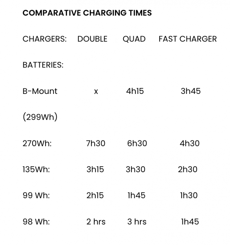 Above you can see how long various capacity batteries take to charge using the SHAPE 450W USB-C Fast Charger Kit for Gold Mount/V-Mount/B-Mount Batteries when compared to traditional quad and doubler charges.