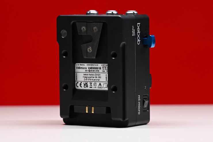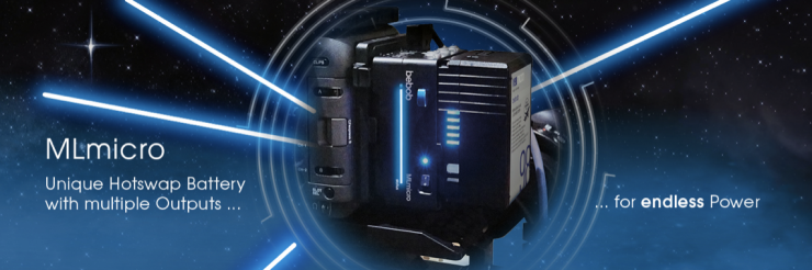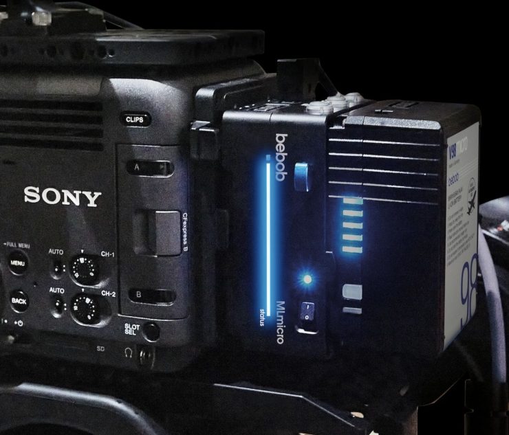 The bebob ml-micro is a rechargeable Li-ion hot swap battery with a V-mount to V-mount power adapter that also features numerous outputs for running accessories.