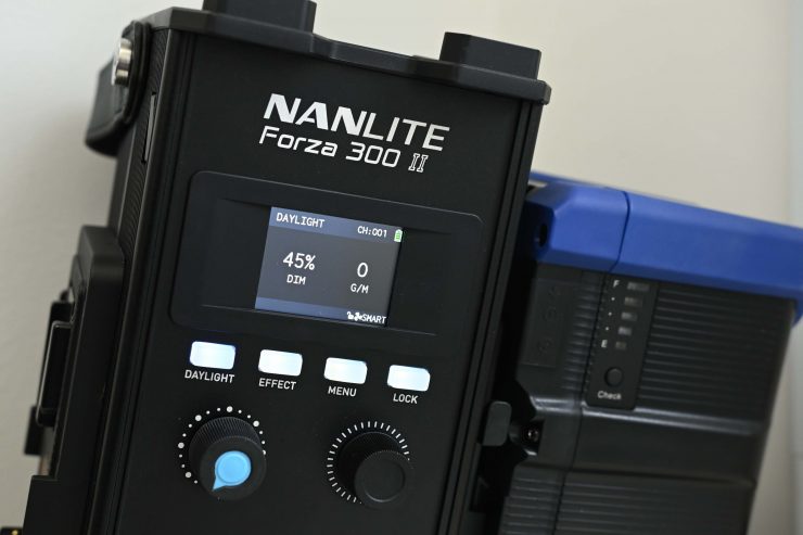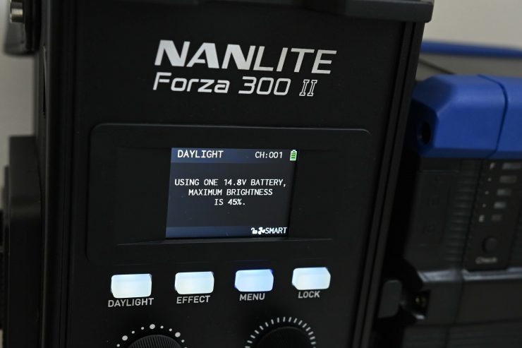 It is the same case with a light like the Nanlite Forza 300 II. Even though it has a maximum power draw of 350W, it still can’t be run at 100% output from the FXLION BP-HP600. You can only run the light at 45% via a single battery, regardless of the capacity.