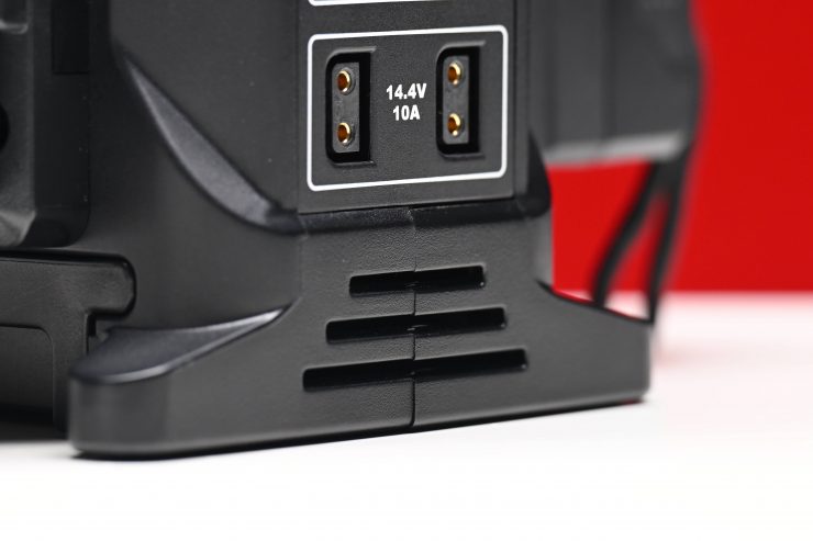 There are also two AC sockets that can take any AC power connector type in the world. This means you can use it to not only charge batteries but also to power lights, wireless video transmitters, monitors, etc. This is very handy if, for instance, you have lights that can’t be run via a battery, but can be run via mains power. You can simply use V-lock batteries to power the light remotely.