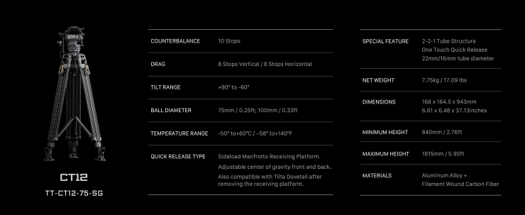 The CT12 features 10 stops of counterbalance with 10 stops of verticle and horizontal adjustments with up to 17.5lb payloads. Both models have +90° / -60° tilt range.