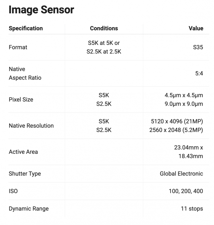 The 2.5K sensor has 9uM pixels so it retains the same crop factor as Ember S5K. It is also nice and compact and the camera weighs in at just 800g / 1.76 lb. The sensor size is 2560 x 2048.
