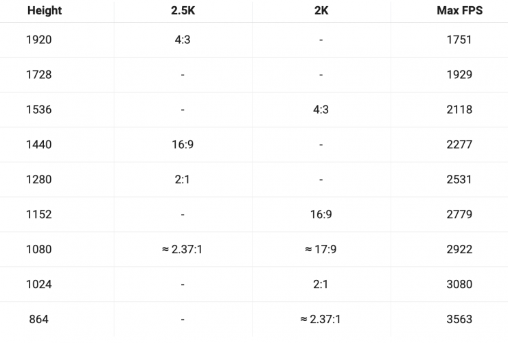 The table above lists the Width (top row) and Height (left column) combinations supported by the Ember S2.5K in full color and the Ember S5K in monochrome (available for all Ember S5K in FW 2.0, coming soon). Both use 2×2 pixel binning, but only the S2.5K has a matching Quad Bayer color filter array. Only Height affects the maximum frame rate (right column). 2K width is center-cropped. Common aspect ratios are noted.