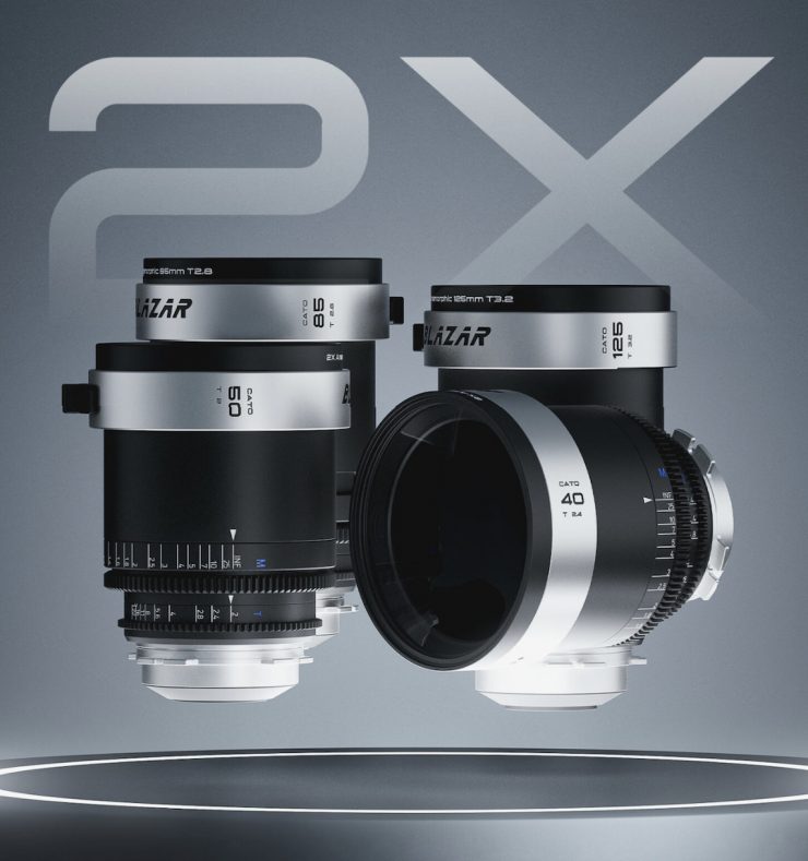 Blazar Lens announced its new Cato 2x Anamorphic series at NAB 2024 in Las Vegas. The Cato Series features a consistent, 2x anamorphic squeeze ratio and covers large formats. The 4 lens set includes a 40mm T2.4, 50mm T2, 85mm T2.8, and 125mm T3.2.