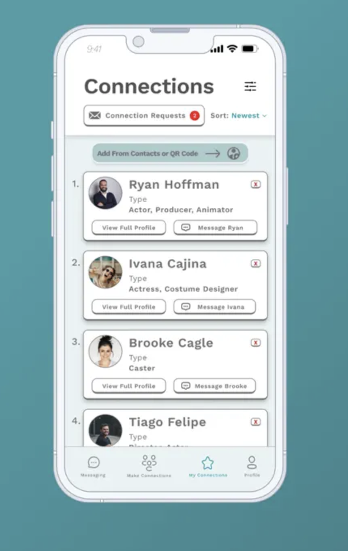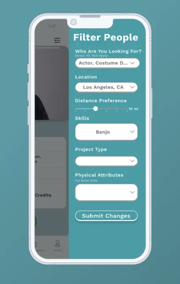 The app features a simple, easy to use interface that allows creatives to access and communicate with their connections as well as find other creatives to grow their network. Profiles consist of roles, headshots, experience, and project types so that each person can showcase their resume. Filters decrease search time and improve accuracy of results.