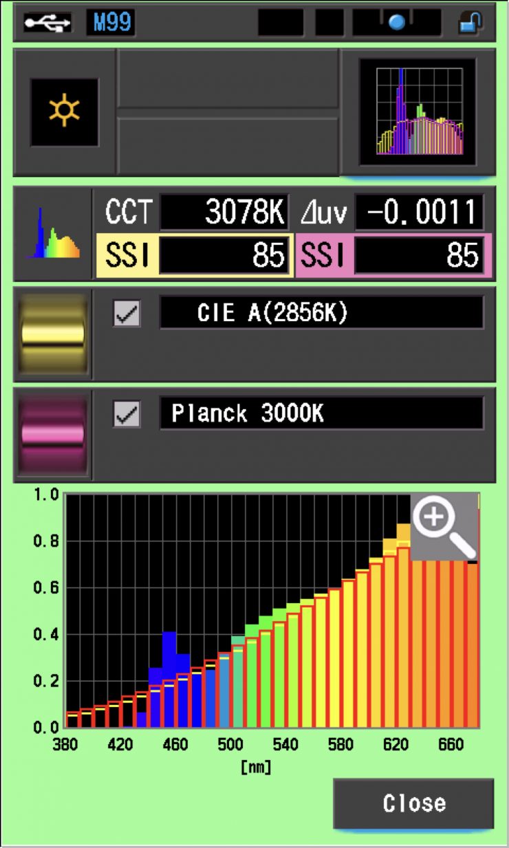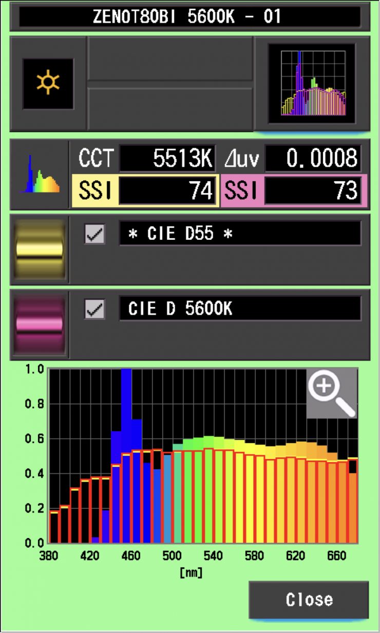 SSI (Spectral Similarity Index) was developed by the Sci-Tech Council of the Academy. SSI gives me the ability to set any light as a standard, or use predefined standards (such as CIE D55), and then give other lights an SSI score based upon how well they will match standards such as CIE D55 measure spectral response and compare it directly against an ideal light source.