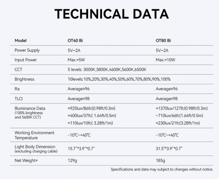 The lights have a built in cable with a regular USB-A connector at the other end. This is somewhat limiting as you need to power the lights via a power bank or a battery that can provide 5V 1A for the OT40Bi or 5V 2A for the OT80Bi.