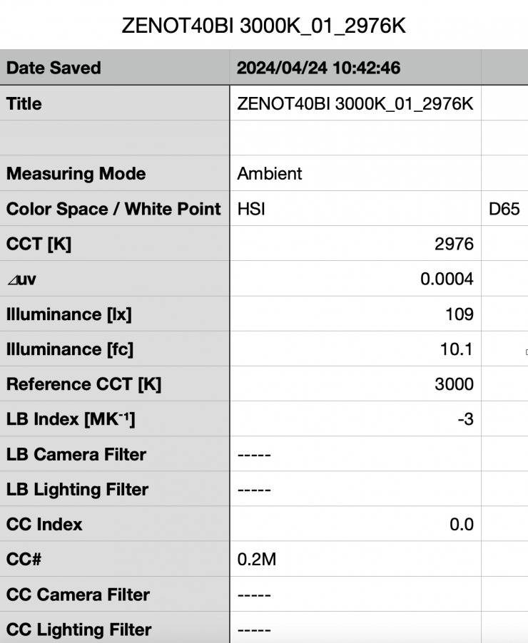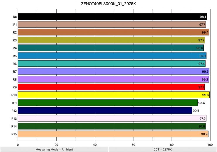 The ZENIKO OT40 Bi produced a CCT reading of 2976K, which was an excellent result