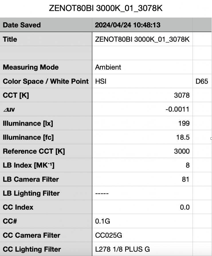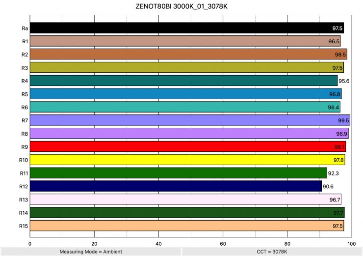 The ZENIKO OT80Bi produced a CCT reading of 3078K, which was a good result.