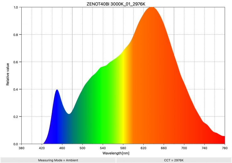 Above you can see the spectral distribution of the ZENIKO OT40 Bi when it is set at 3000K. The spectral distribution is pretty good.