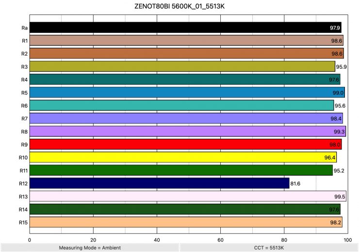 Above you can see the spectral distribution of the ZENIKO OT80 Bi when it is set at 5600K. Again, just like the OT40 Bi, the spectral distribution is decent enough.