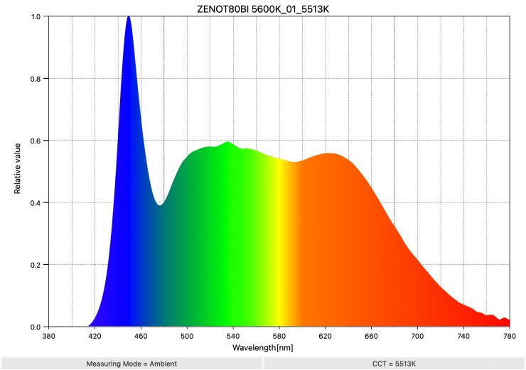 Above you can see the spectral distribution of the ZENIKO OT80 Bi when it is set at 5600K. The spectral distribution is decent enough.