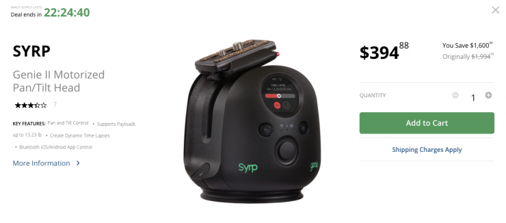 The Syrp Genie II Motorized Pan/Tilt Head is on sale for $394.88 USD which is a whopping saving of $1,600 USD.