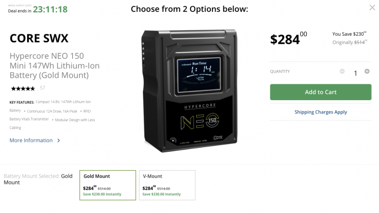 The Core SWX Hypercore NEO 150 Mini 147Wh Lithium-Ion Gold Mount & V-Mount Batteries are on sale for $284 USD. This is a saving of $230 USD.