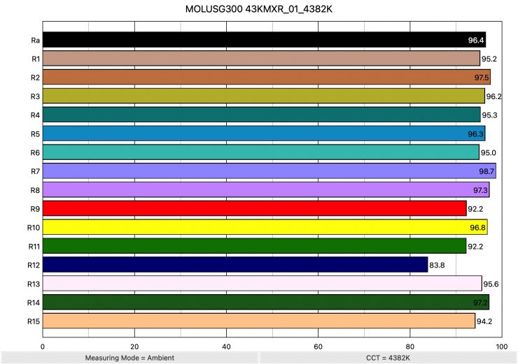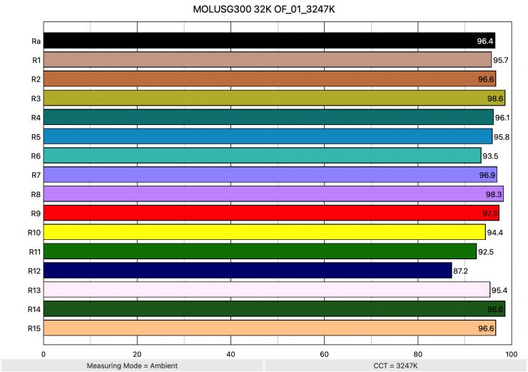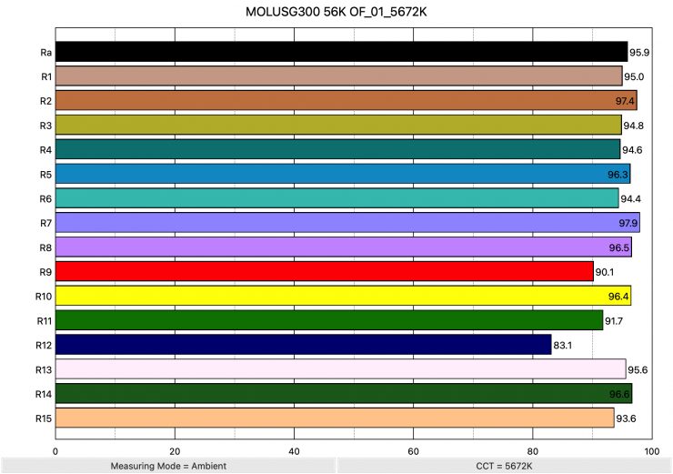 In the graph above the gold bars indicate a perfect CIE D55 source. The red bars indicate a perfect CIE D 5600K source. This lets us compare how close to a perfect 5600K lighting source the MOLUS G300 is. A score in the low 70’s is typical for a 5600K LED source.