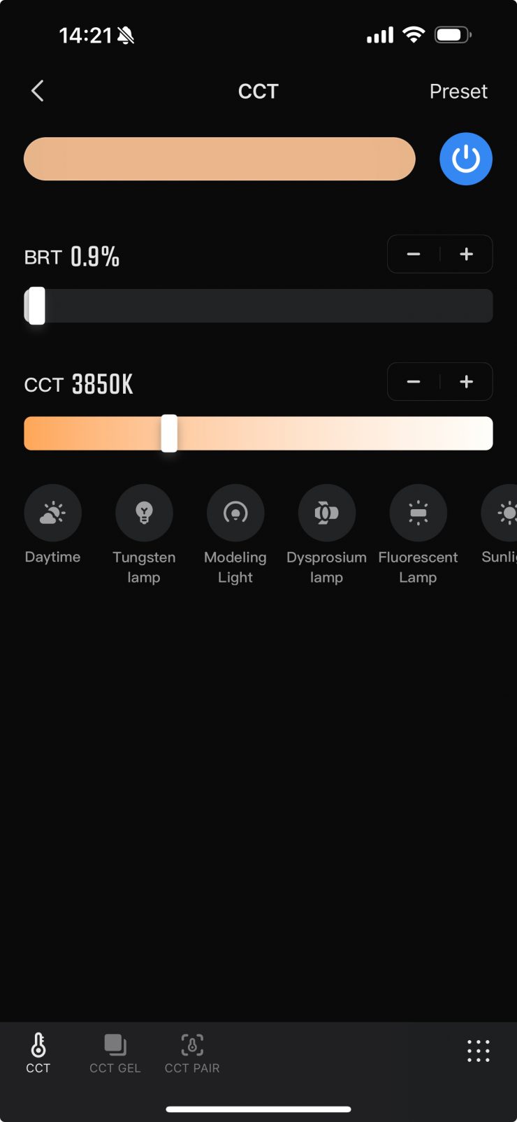 There is also the ability to access two other modes that also can’t be accessed if you don’t use the app. The first is CCT Gel where you can apply CTO gels for Tungsten lamp or Dysprosium lamp.