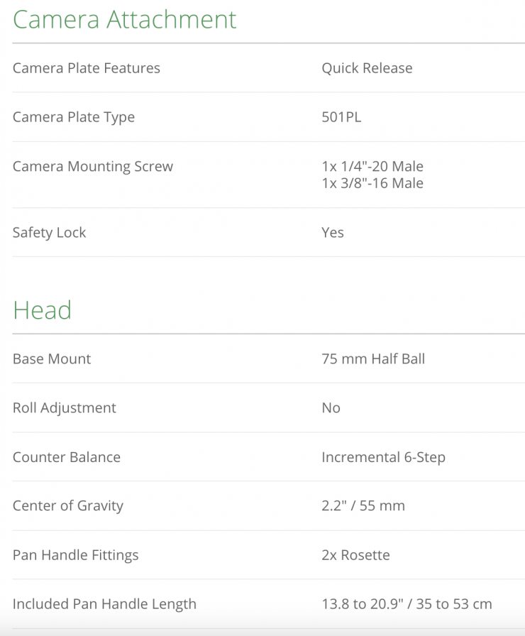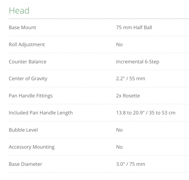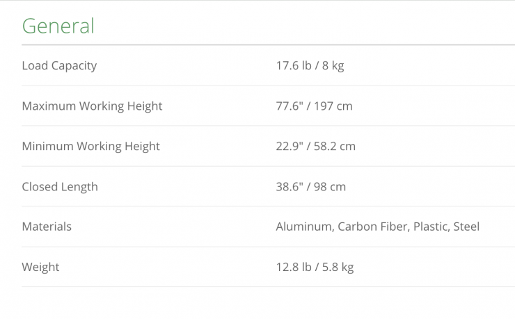 The fluid head features an adjustable 6-step counterbalance system and it can accommodate camera payloads of up to 8kg / 17.6lb. The tripod itself weighs 12.8 lb / 5.8 kg.