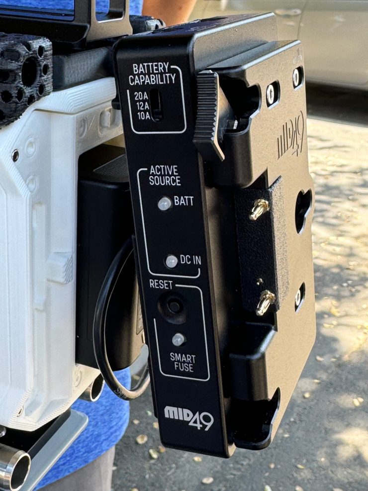 The power distribution unit is on a hinged attachment so you can still get access to the stock battery. It includes 2x 3-pin Fisher (24V) outputs, 2x 2-pin LEMO (12V), and 2x D-taps.