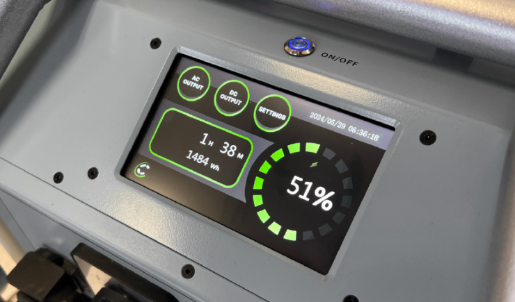 The unit features a 5” touchscreen display that provides real-time information on battery status, output levels, and system diagnostics.