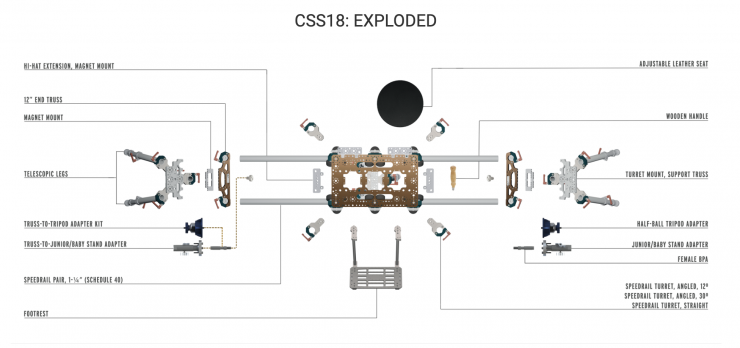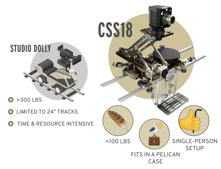 Weighing under 100 lbs, the CSS18 is being touted as the first truly portable camera dolly that can be set up by one person and transported in a large Pelican case.