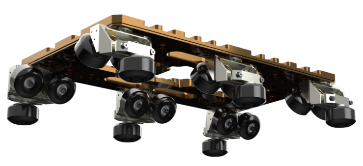 The Constellation Shooting Star is a hybrid camera dolly system that combines the comfort and control of a studio-scale dolly, with the portability of a skater. Its namesake 18 wheels are configured in spring-loaded groups, which yield additional stability and smooth motion on both straight and circular tracks.