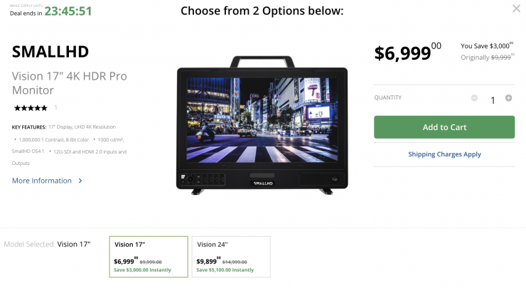 The SmallHD Vision 17″ & Vision 24″ 4K HDR Pro Monitors are on sale. You can get the Vision 17″ 4K HDR Pro Monitor for $6,999 USD which is a saving of $3,000 USD. The Vision 24″ 4K HDR Pro Monitor is on sale for $9,899 USD which is a saving of $5,100 USD.