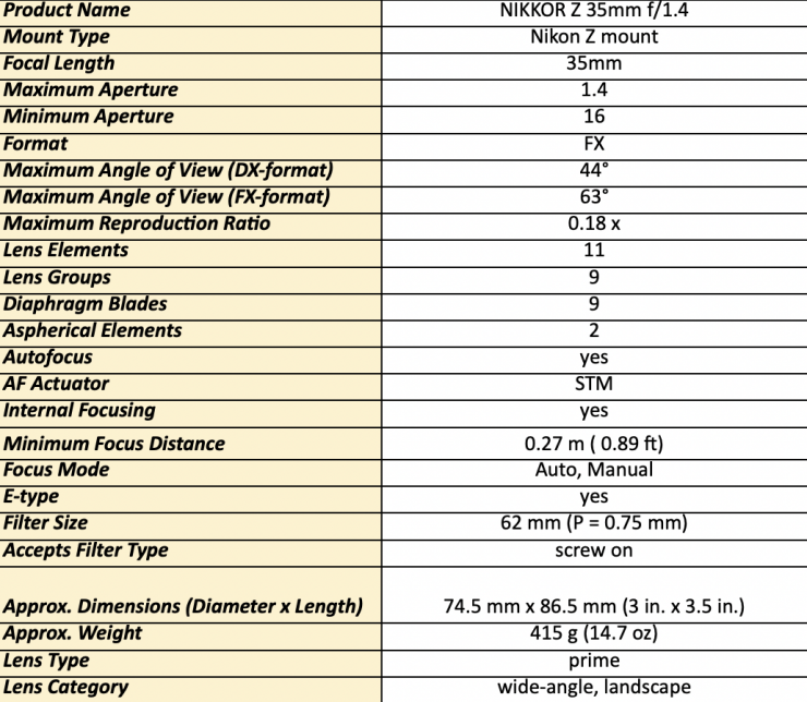 Primary features of the Nikon NIKKOR Z 35mm f/1.4: