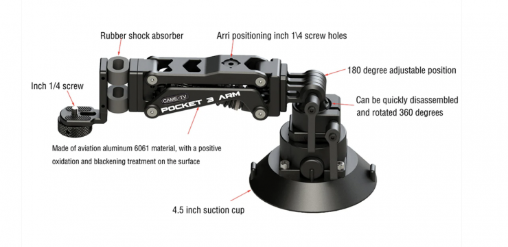 CAME-TV has announced its new Multifunctional Shock Absorber Arm that was designed for use with cameras such as the DJI Pocket 2, Pocket 3, OSMO, GOPRO, 360 action cameras, and smartphones.