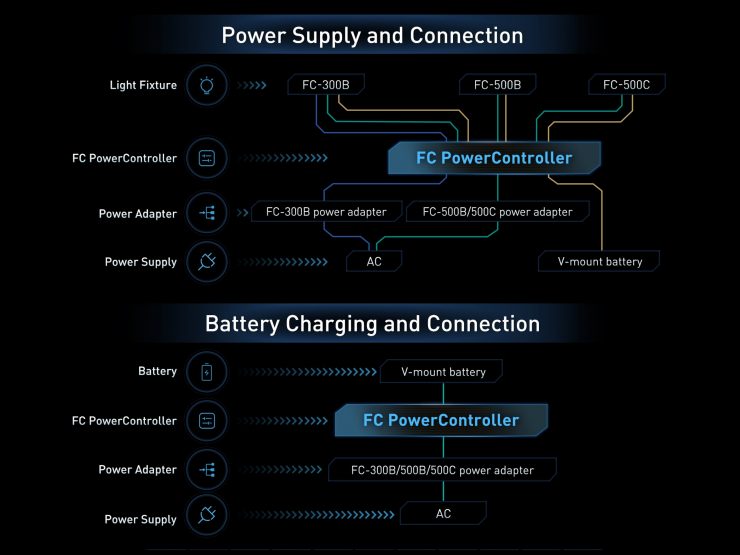 Connecting the FC PowerController allows the FC-300B/500B/500C to be powered by either one or two 14.4-14.8V / 26V batteries. The maximum output of each different fixture varies depending on the quantity and voltage of the V-mount batteries used. For instance, it requires two 26V high-performance V-lock batteries to run the FC-500C at full output. Using a single 14.4V battery on the same light will limit output to 30%.
