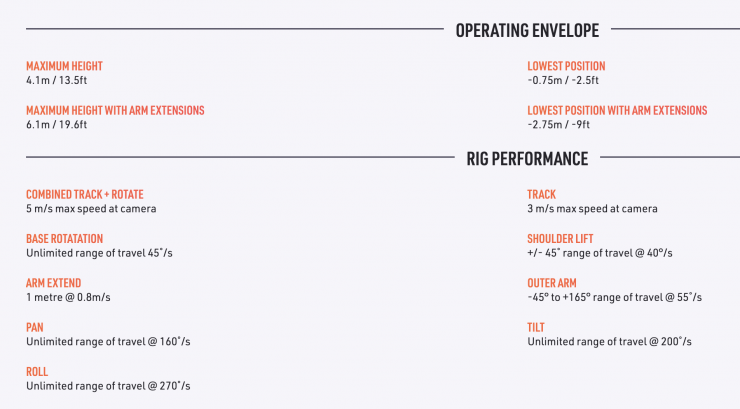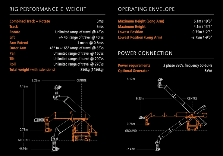 With easy-to-fit extensions, it offers flexible shooting configurations. Electronic lifting actuators expedite track setup. The setup takes under an hour and is fitted with an electric jacking system that makes rail assembly fast.