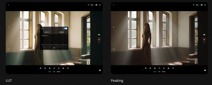 The app also has monitoring assistance tools such as LUT, peaking, waveform, and false color,