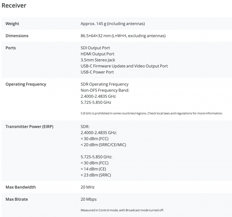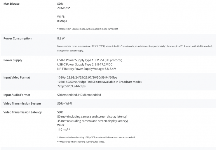 With SDR technology, the DJI SDR Transmission is claimed to ensures stable video transmissions even in complex shooting environments. On the monitors, filmmakers will see 1080p/60fps live feeds with a bitrate of up to 20Mbps and a delay as low as 35 milliseconds.